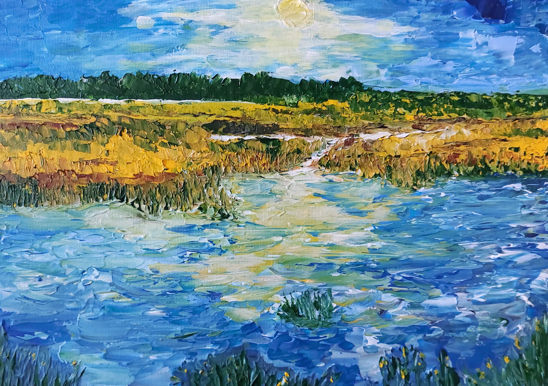 Le spectateur est transporté vers un paysage aquatique baigné de soleil, où la frontière entre abstraction et figuration s'estompe. L'œuvre est une étude puissante des reflets de midi, capturée dans une palette vive de bleu céruléen, d'outremer profond et de nuances chaudes d'ocre et d'or.