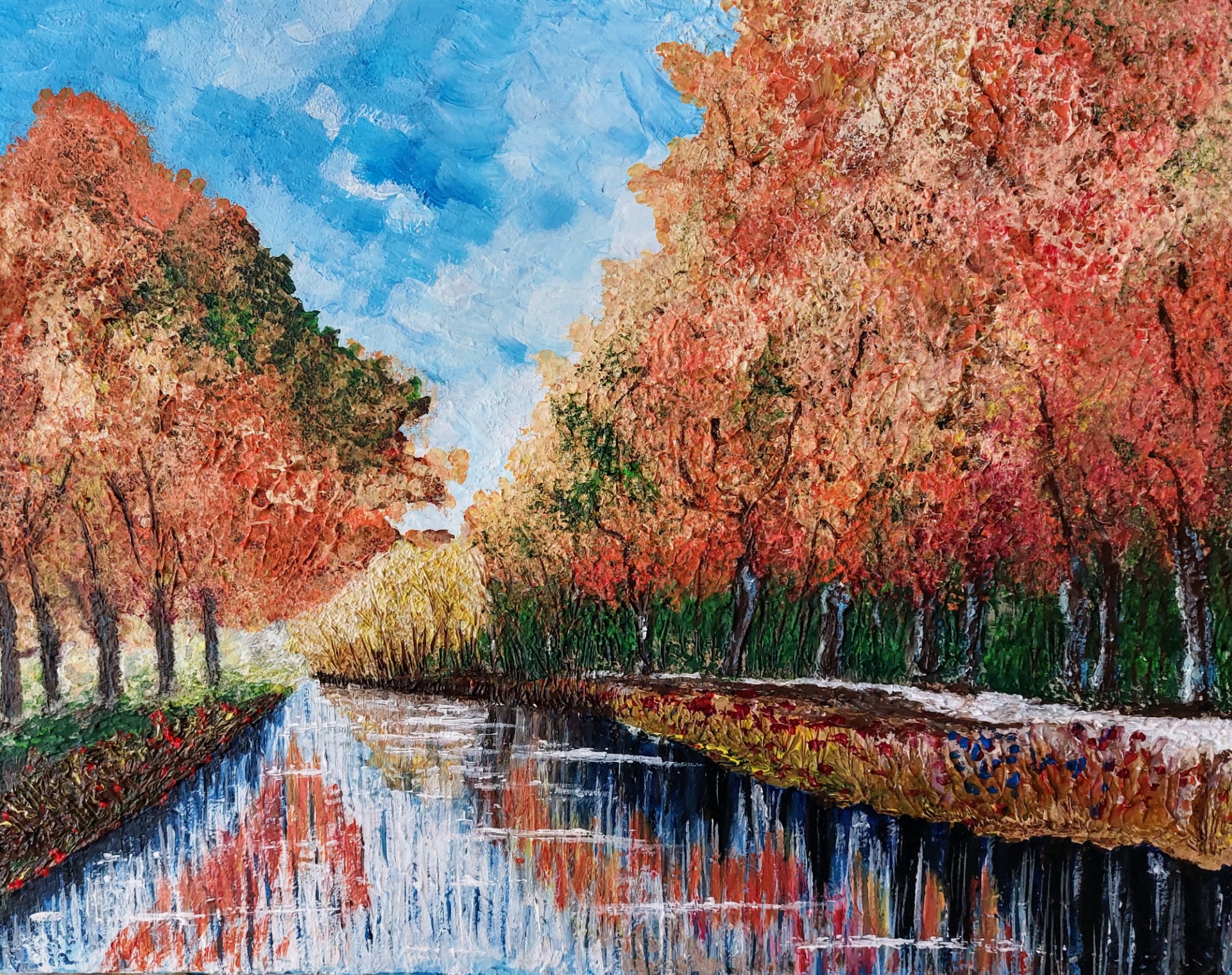La composition s'équilibre entre les lignes verticales strictes des troncs d'arbres et le calme horizontal du reflet dans le canal. Les contrastes vifs entre les tons de rouille ardents et le bleu azur limpide du ciel créent une énergie vibrante, renforcée par la profondeur tactile des coups de pinceau.