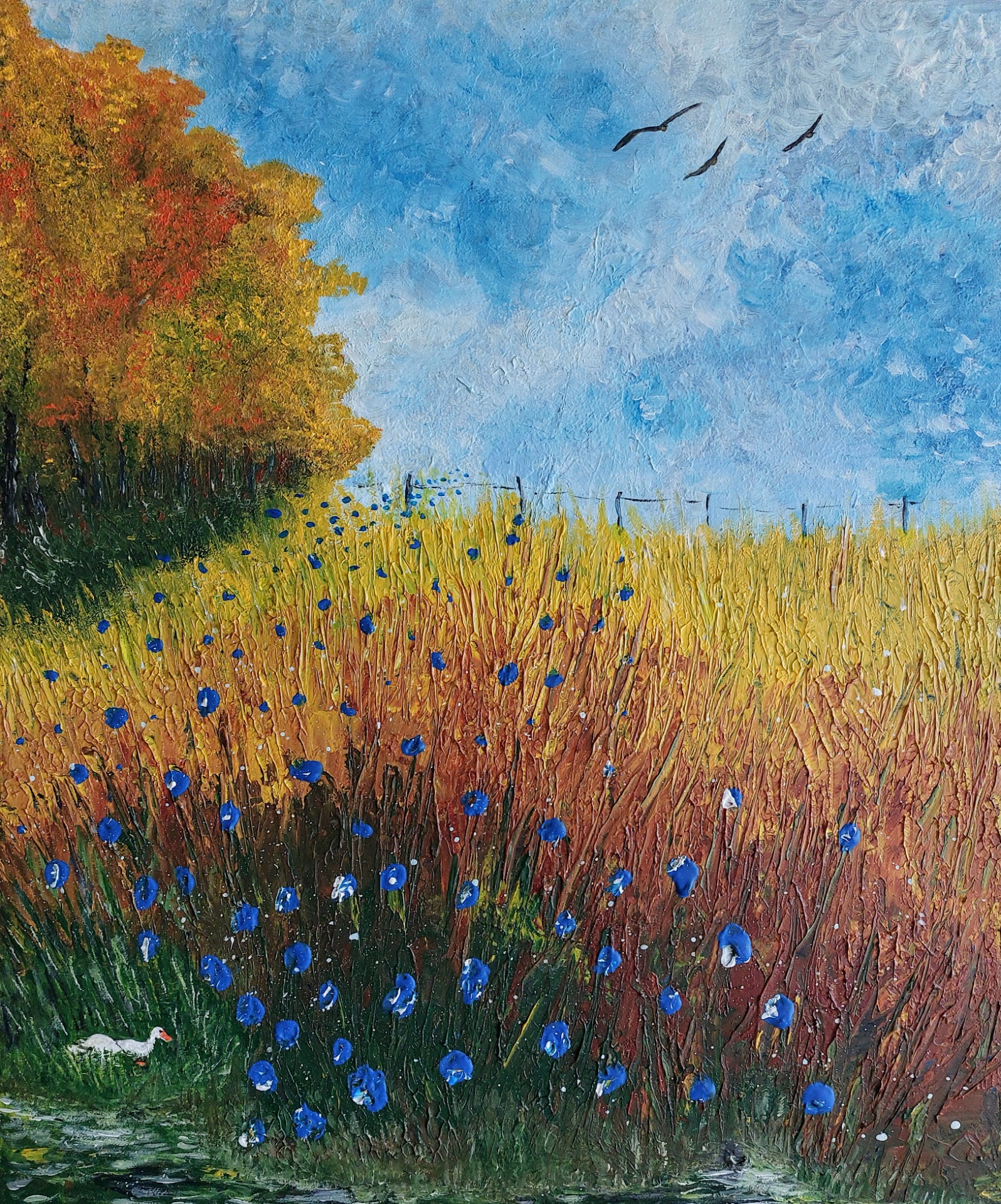 Dans cette œuvre, l'expérience tactile est centrale. En appliquant la technique de l'Impasto de manière cohérente, le champ de céréales doré acquiert un relief sculptural qui rend tangible la dynamique du vent. Les « Éclats d'Azur » — les fleurs d'un bleu profond — sont appliqués par touches épaisses et pâteuses, ce qui les fait littéralement surgir de la toile pour capturer la lumière environnante.