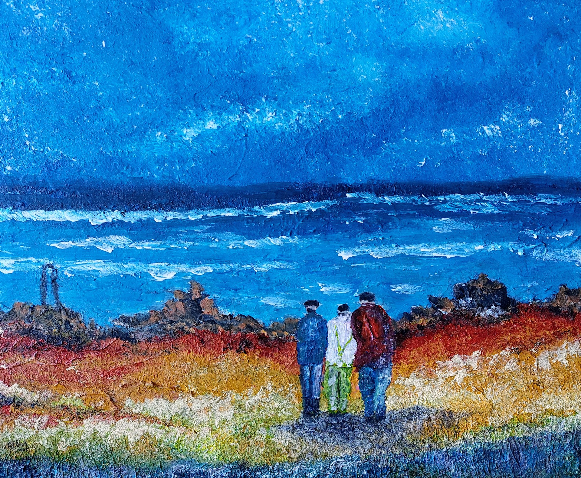 Texture & Profondeur : L'utilisation de touches impasto denses crée un relief dynamique. Le premier plan brut, réalisé dans des tons terreux de rouille et d'ocre, forme un contraste tactile avec les bleus vibrants de l'océan et le ciel atmosphérique.